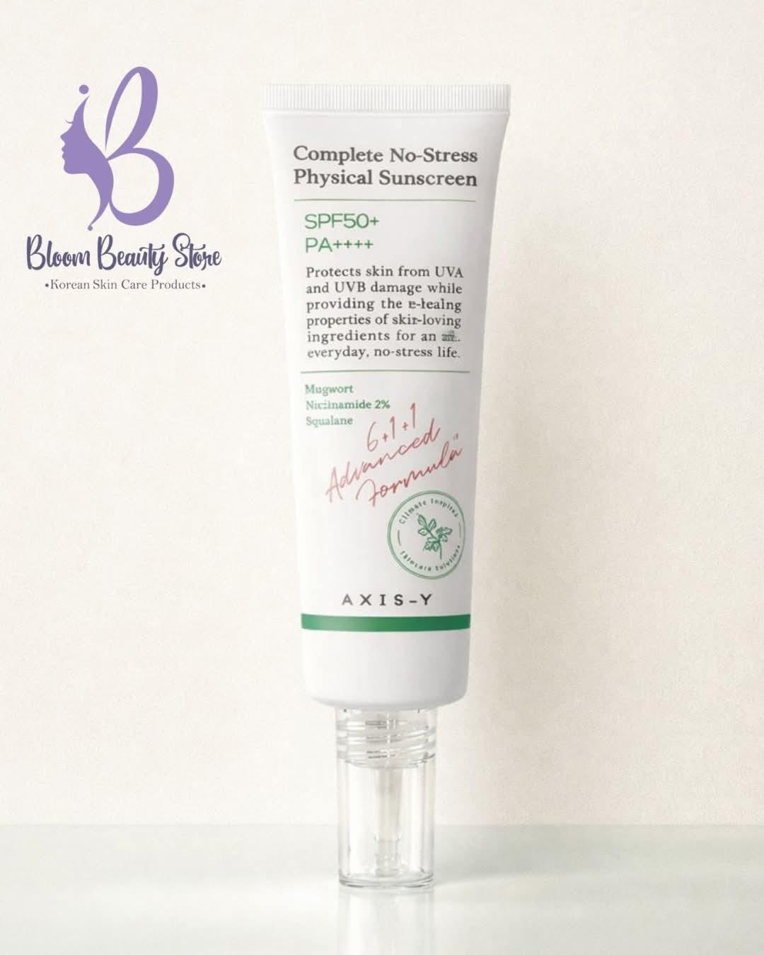💚واقي الشمس الفيزيائي من اكسيس واي (Axis-Y Complete No-Stress Physical Sunscreen) هو واقي شمسي كوري خفيف الوزن يوفر حماية عالية (SPF 50+ PA++++)، ويتميز بتركيبة لطيفة غنية بمكونات مهدئة مثل مستخلص الشيح (Mugwort) والنياسيناميد وحمض الهيالورونيك لتفتيح البشرة، وترطيبها، وحمايتها من أضراد الشمس والتهيج، وهو مثالي للبشرة الحساسة والمعرضة لحب الشباب، ويُمتص بسرعة دون ترك أثر دهني أو طبقة بيضاء. 💚